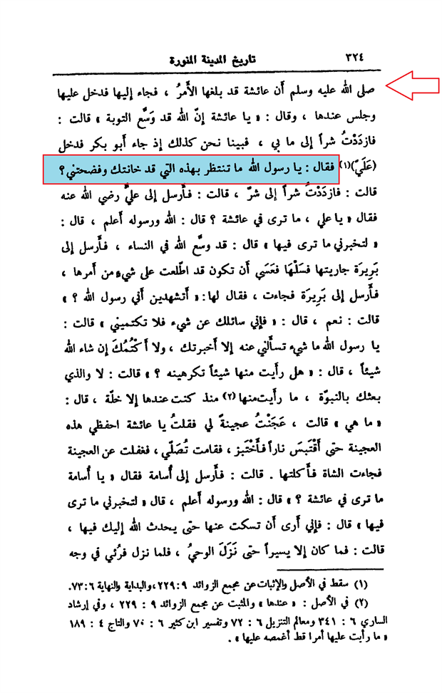 عمر بن شبة نمیری (متوفای 262هـ ) در کتاب تاریخ المدینه با سند معتبر حدیث افک را نقل کرده است . در یکی از روایات در بخشی از روایت مینویسد: