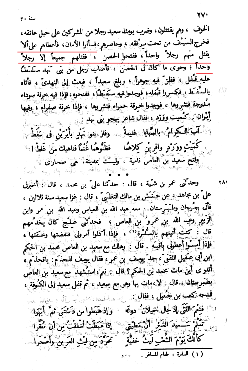 یک مرد. سپس در قلعه را گشودند و آنچه که در قلعه بود غارت کردند.تاریخ الطبری، ج4، ص269 و 270 ، دارالمعارف مصر و الکامل فی التاریخ، ج3، ص7، دار الکتب العلمیة.