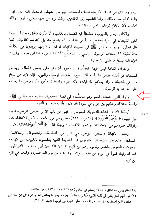 ولهذا ألقى الشیطان لعمر وهو محدث فی قصة الحدیبیة وقصة موت النبى وقصة اختلافه وحکیم بن حزام فی سورة الفرقان فأزاله عنه نور النبوة